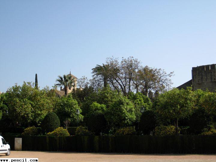 Ciudad de Cordoba.: El Alcazar. Jardines prximos a las estatuas de los reyes catlicos y Colon