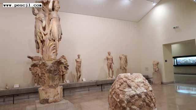 Grecia continental: Delfos. Museo del santuario Sobre la Grecia clsica. Zona con esculturas, donde se encuentrs una copia del onfalos u ombligo del mundo