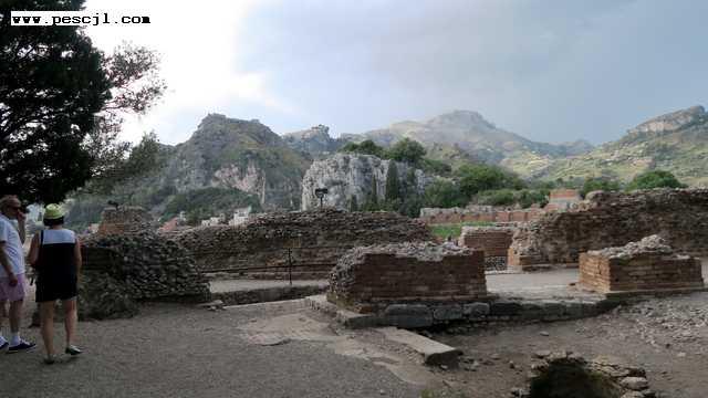 Sicilia: Taormina Teatro griego. Vistas a el mar. Zona de la Isla Bella