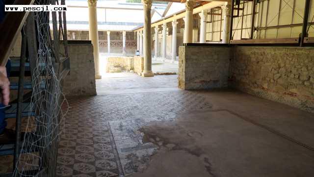Sicilia: La villa romana de Casale: Saliendo al exterior y entrando a la zona central (entorno al peristilo con jardin y estanque)